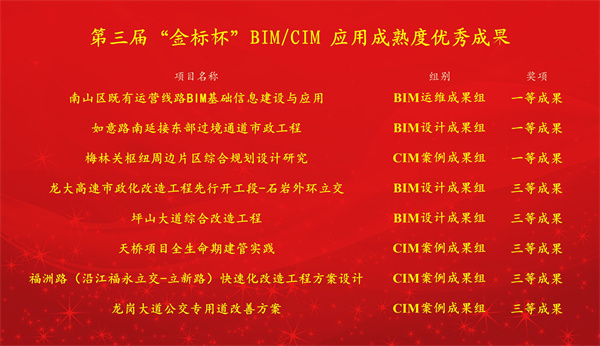 日前,由全國智能建筑及居住區(qū)數(shù)字化標準化技術委員會組織舉辦的第三屆“金標杯”BIM/CIM應用成熟度優(yōu)秀成果遴選大賽公布獲獎結果,公司參賽項目在全國1500多項參賽作品中脫穎而出,攬獲8項大獎,成為全國唯一同時榮獲設計組、運維組、CIM創(chuàng)新組一等獎的單位。