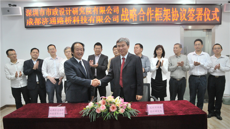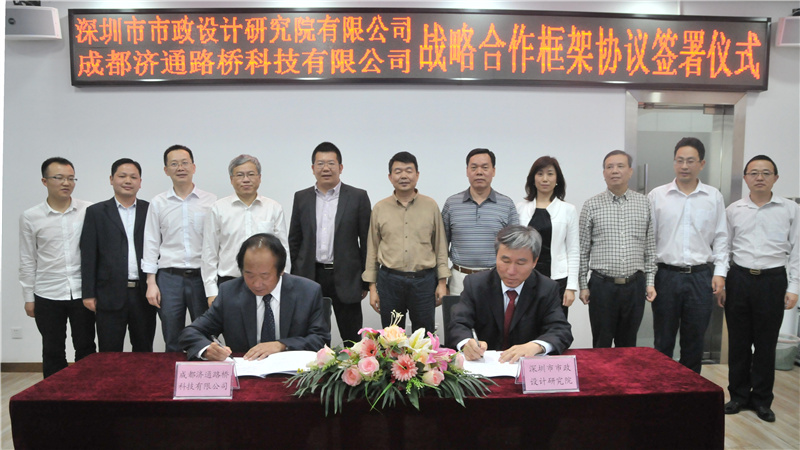 2017424日下午,我公司與成都濟通路橋科技有限公司(以下簡稱“濟通科技”)戰(zhàn)略合作框架簽署儀式在公司一樓技術(shù)交流中心舉行,董事長陳宜言設(shè)計大師和濟通科技伍廷貴董事長代表雙方簽字。蔡明總經(jīng)理、宋榮亮主席、郭明副書記、王建新副總經(jīng)理、張健君副總經(jīng)理、許華林副總經(jīng)理、徐波總工程師以及相關(guān)部門負責人和專業(yè)總工,濟通科技伍大成總經(jīng)理、趙鵬賢副總經(jīng)理,鄒貽軍技術(shù)總監(jiān)、技術(shù)部高建主任出席簽署儀式。儀式由我公司黨委副書記、紀委書記、工會主席郭明主持。