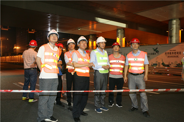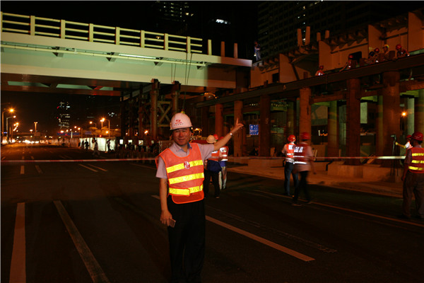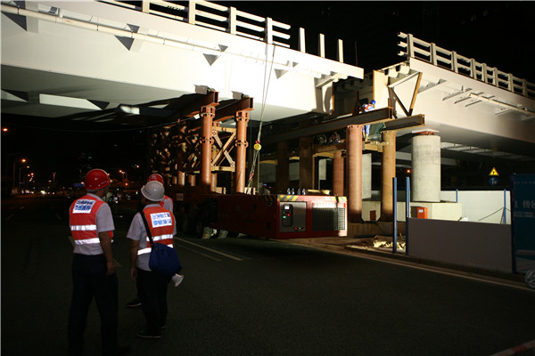 為保證架橋期間深南大道的交通連續(xù),施工采用夜間施工,選擇主線單邊雙向通行的交通疏解方案。采用SPMT模塊車架橋可以將傳統(tǒng)施工工藝7天的工期縮短為14小時左右,大大加快了整個架橋進度,并且把對周邊環(huán)境和交通的影響降到了最低。橋梁架設(shè)期間,我公司副總經(jīng)理歐陽宇峰、橋梁總工王先前、市政四院副院長喬曉冉及項目組成員王延飛、孫志國等作為技術(shù)服務(wù)組全程提供技術(shù)支持。董事長陳宜言大師不辭辛苦,外地開會后晚間23:00趕回深圳,就直赴現(xiàn)場指導(dǎo)橋梁架設(shè)。