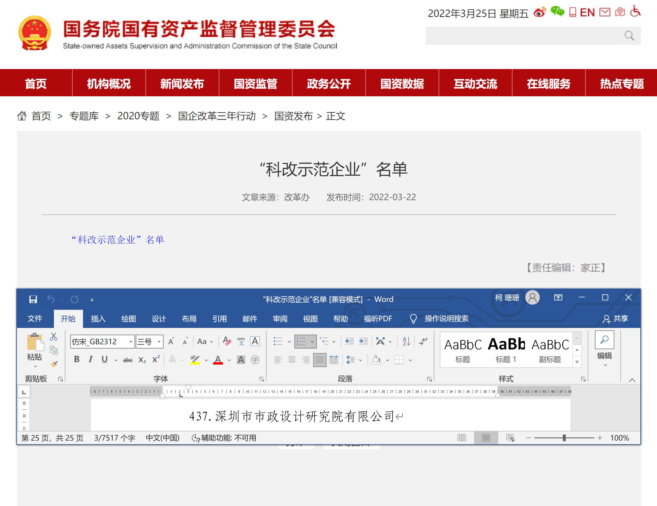 日前,國(guó)務(wù)院國(guó)資委公布最新的“科改示范企業(yè)”名單,深圳國(guó)資系統(tǒng)7家企業(yè)成功入選,深圳市政院榜上有名。